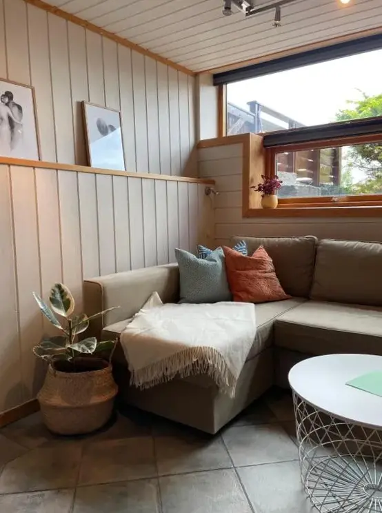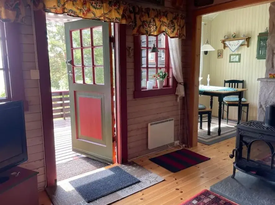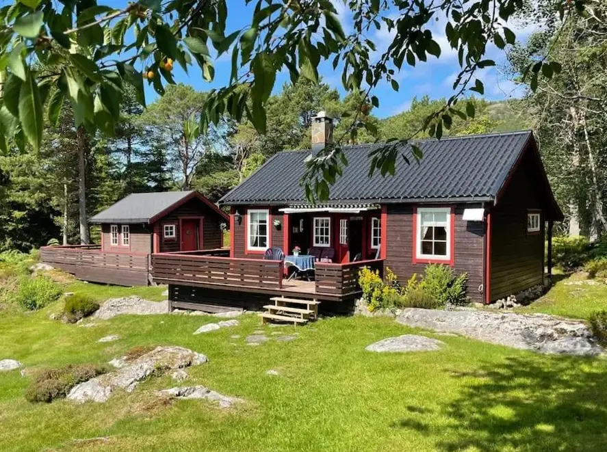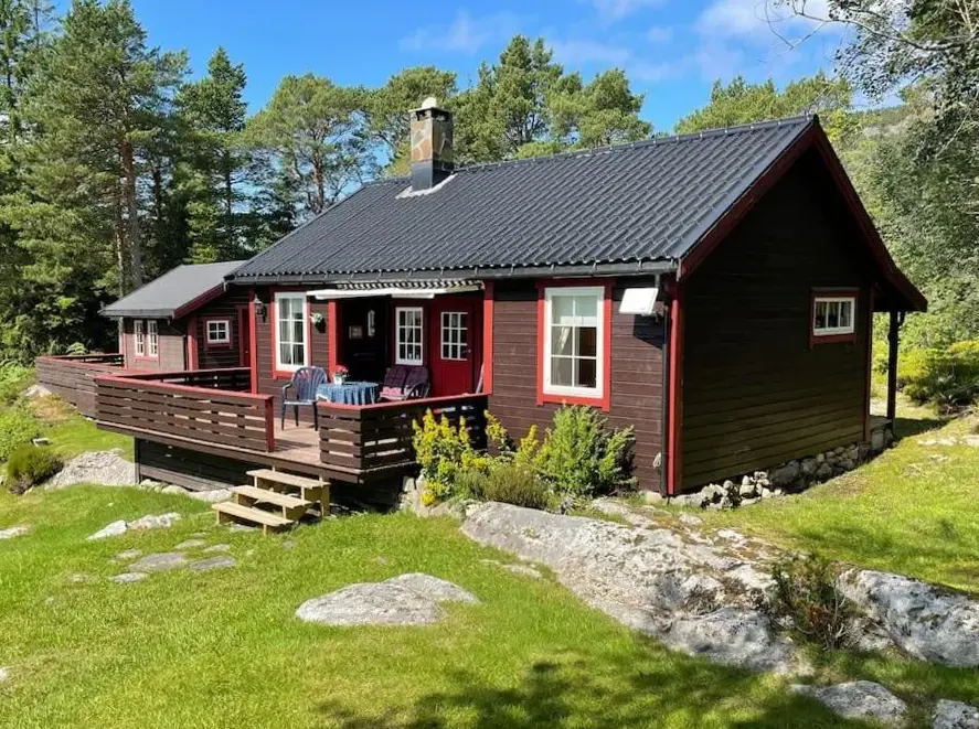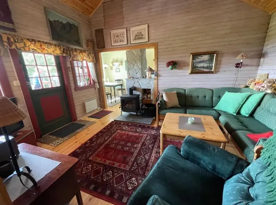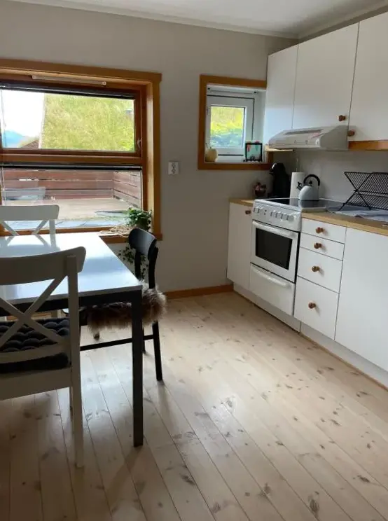 More information about Sokkelleilighet med 3 soveromSjarmerende hytte omgitt av vakker natur offers a peaceful retreat nestled in a scenic natural setting. The accommodations feature two bedrooms, a fully equipped kitchen with oven, microwave, kettle, and other essentials. Guests can enjoy meals on a veranda overlooking mountain vistas. Reviews highlight the cabin's cozy atmosphere and exceptional views of both the sea and surrounding wilderness.